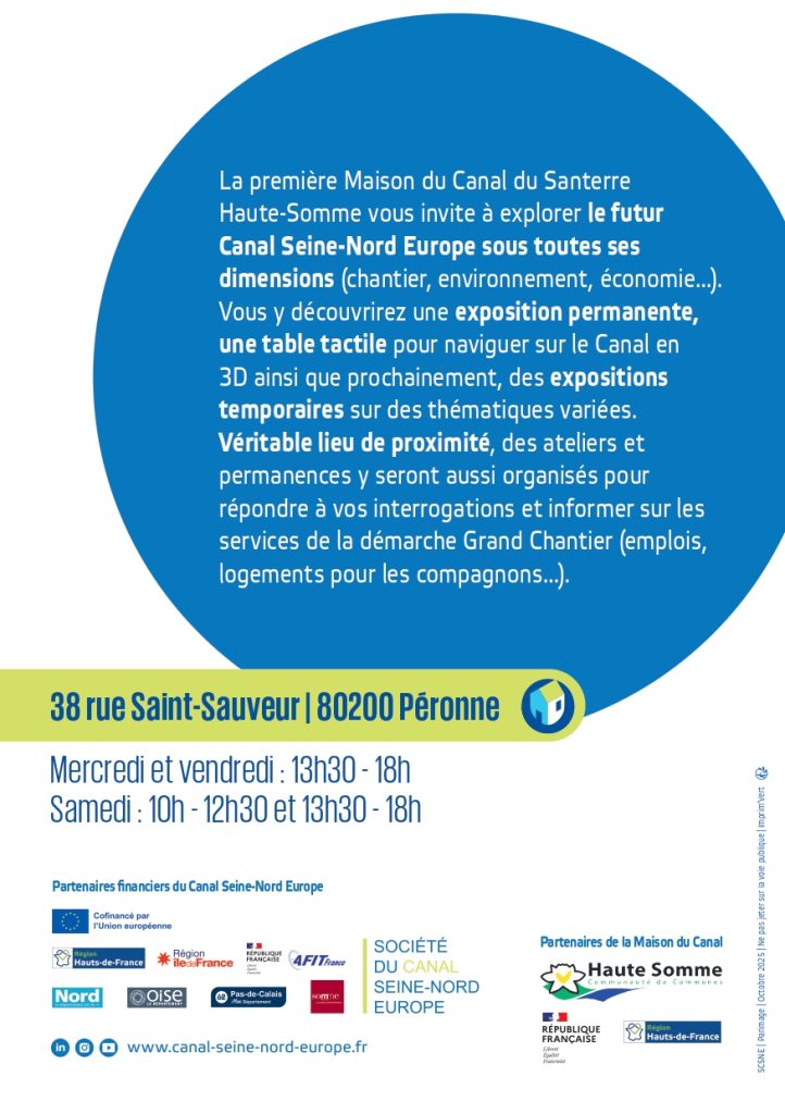 Située en plein cœur de Péronne au 38 rue Saint-Sauveur, la Maison du Canal vous accueille pour découvrir une exposition permanente sur le Canal Seine-Nord Europe, ainsi que des expositions temporaires sur différents thèmes.